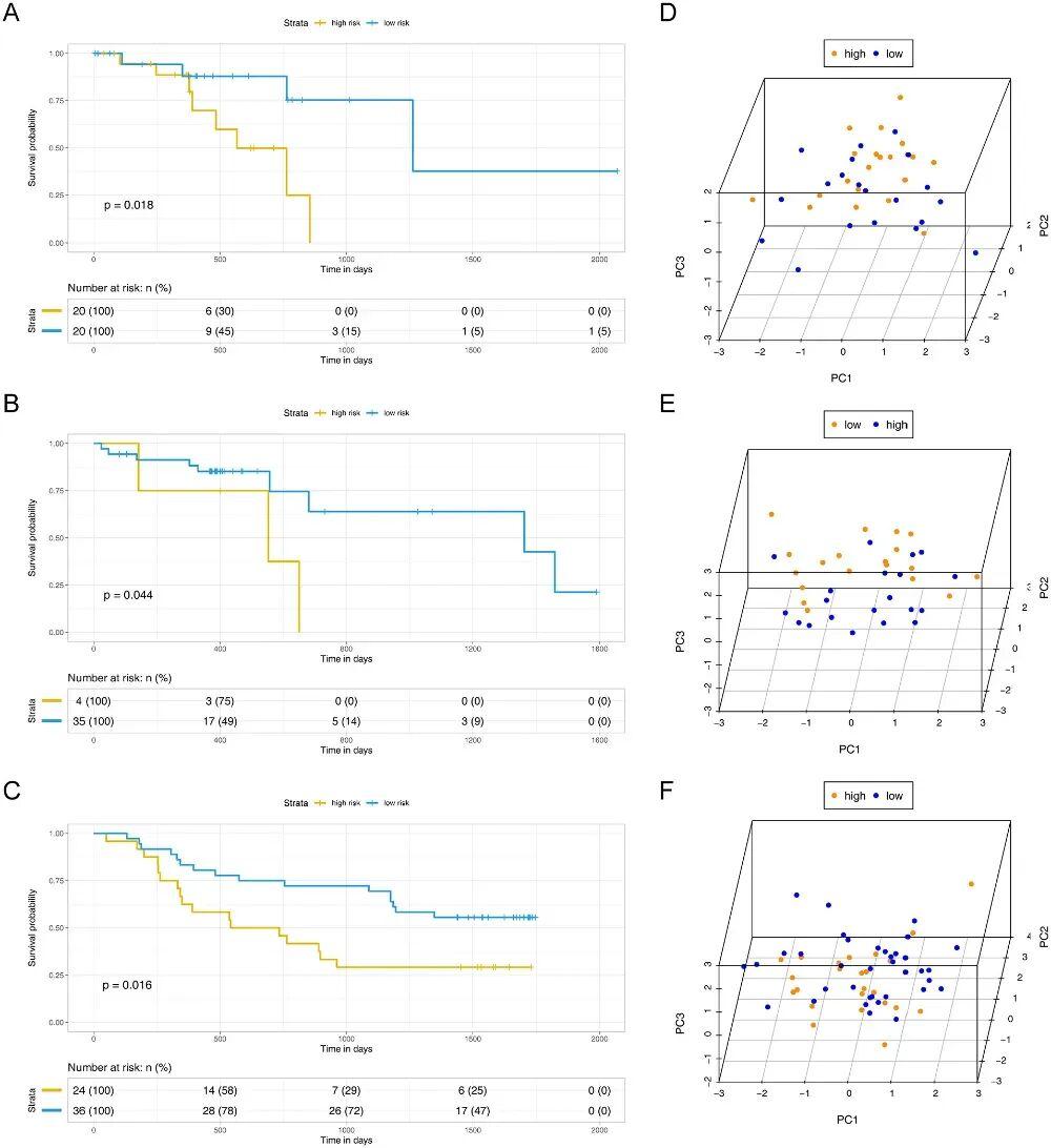 (A–C)根據“牙齦卟啉單胞菌感染相關基因特徵”的表達水平,研究人員將患者分爲高表達組和低表達組,比較兩組患者的總生存期(Kaplan–Meier 生存曲線) | 參考資料[2]