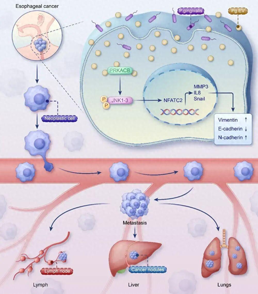 [1]Hong K, Zhang H, Qi J, et al. Porphyromonas gingivalis extracellular vesicles promote tumor metastasis in esophageal squamous cell carcinoma by inducing the PRKACB/JNK/NFATC2 axis. J Nanobiotechnology. 2026;24:66.