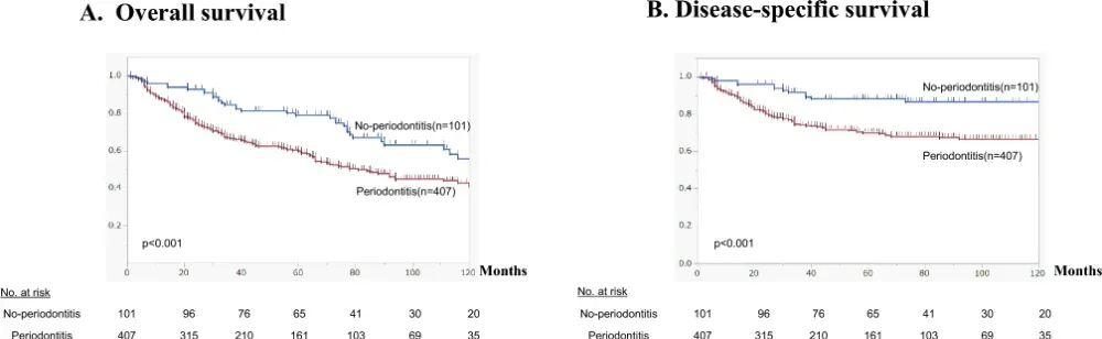 食管切除術後患者牙周炎(伴或不伴牙周炎)與總生存期(OS)(A)和疾病特異性生存期(DSS)(B)之間的關聯 | 參考資料[4]