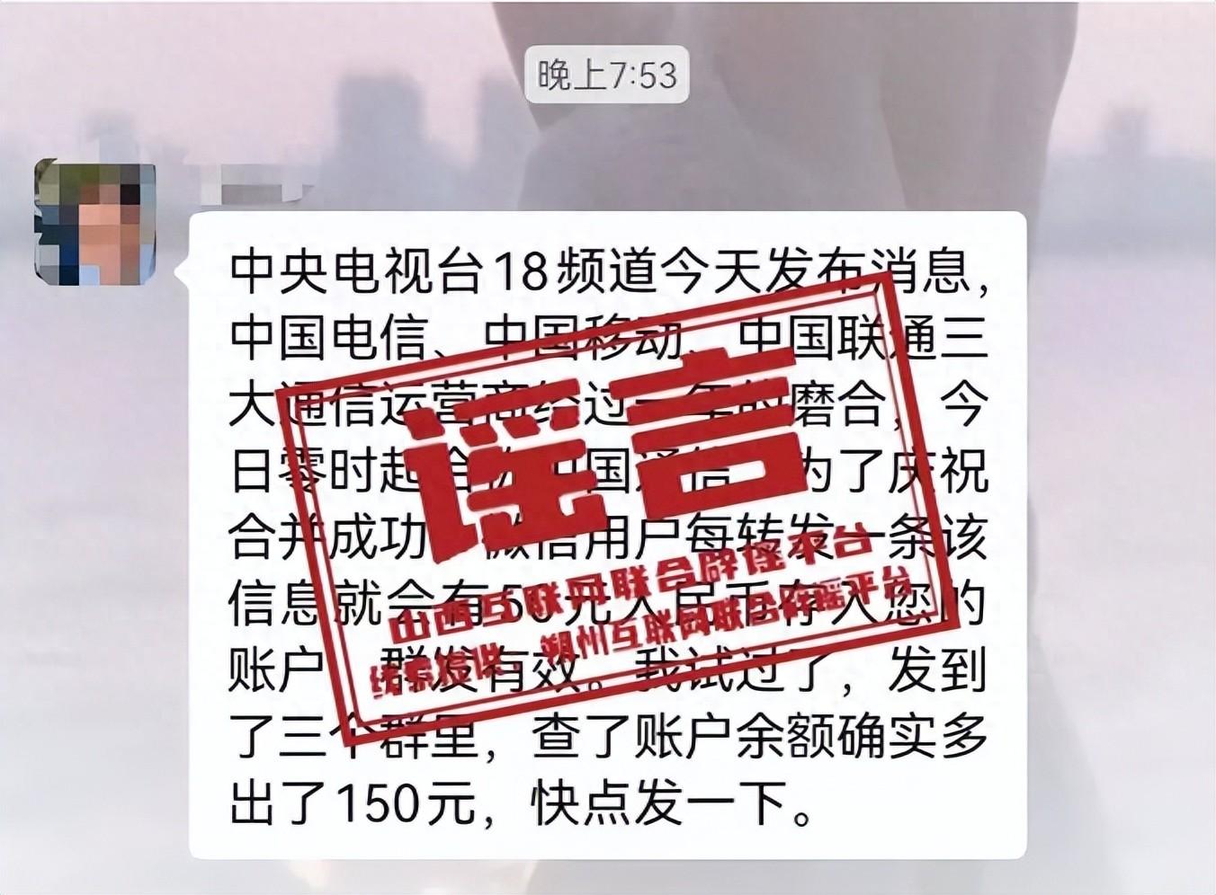 近日,一則“中央電視臺18頻道今天發佈消息,中國電信,中國移動,中國聯通三大通信運營商經過一年的磨合,今日零時起合稱中國通信。爲了慶祝合併成功,微信用戶每轉發一條該信息就會有50元人民幣存入您的賬戶,羣發有效。我試過了,發到了三個羣裏,查了賬戶餘額確實多出了150元,快點發一下。”的消息在山西省朔州市多個微信羣熱傳。經覈實,該消息純屬謠言,請廣大網民切勿輕信、切勿轉發。