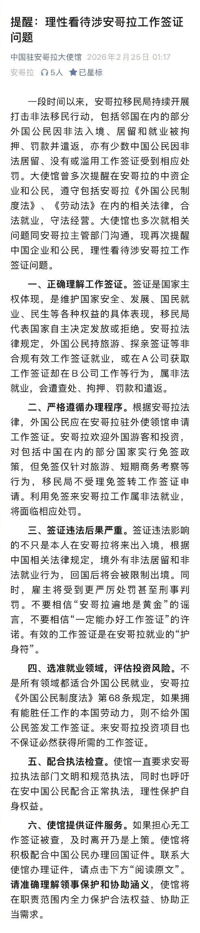 詳情:2月25日,中國駐安哥拉大使館發佈關於理性看待涉安哥拉工作簽證問題的提醒: