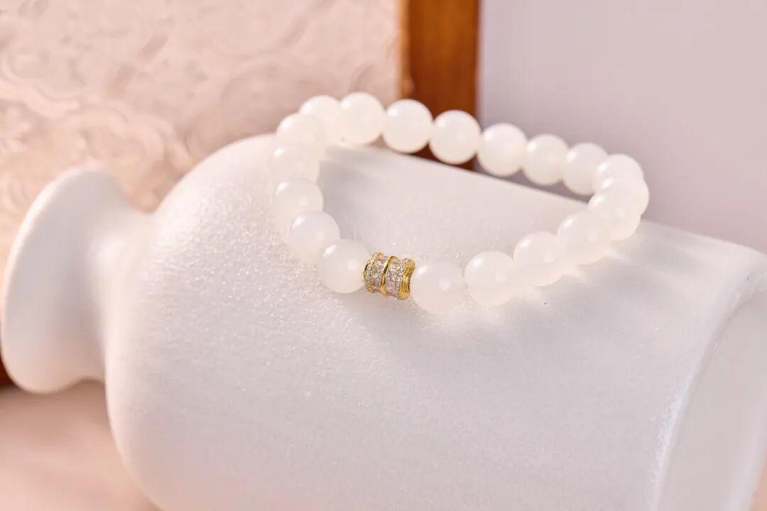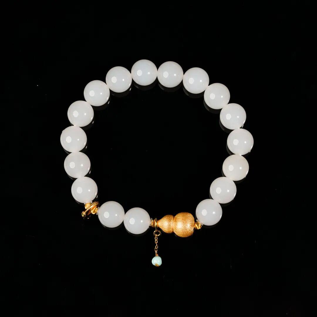 玉料顏色均勻無雜色,光線下能看到淡淡的玉光,和白玉手串搭配成套,就是“人間白月光”既視感。
