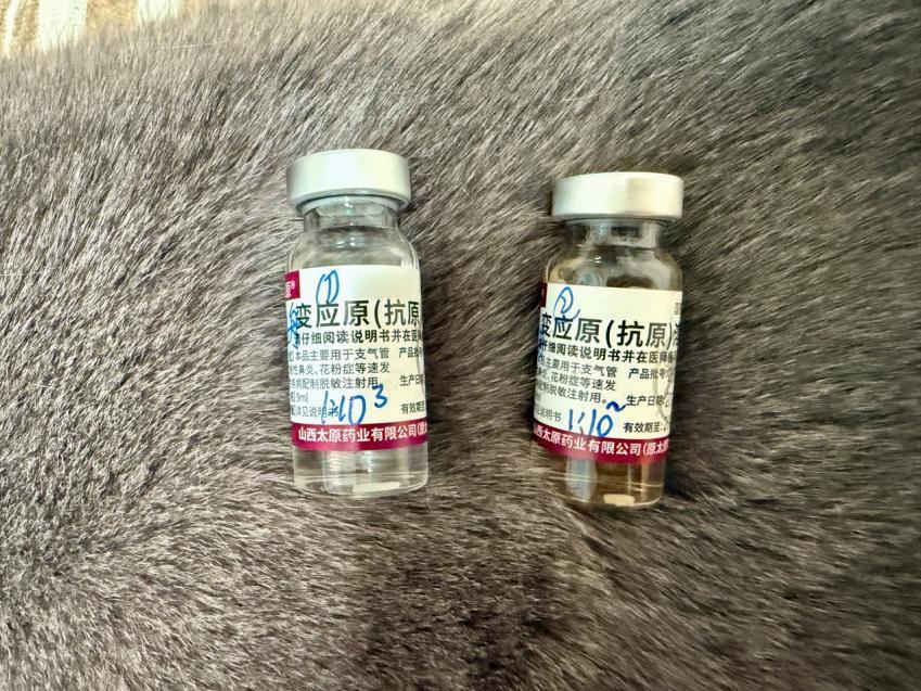 左邊是新開的3號瓶(濃度1:103);右邊是導致我嚴重過敏反應的2號瓶(濃度1:102),已經放冰箱供起來了丨作者供圖