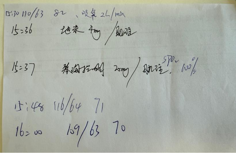 當時醫生寫下的急救記錄,包括時間、血壓、心率和治療措施等丨作者供圖