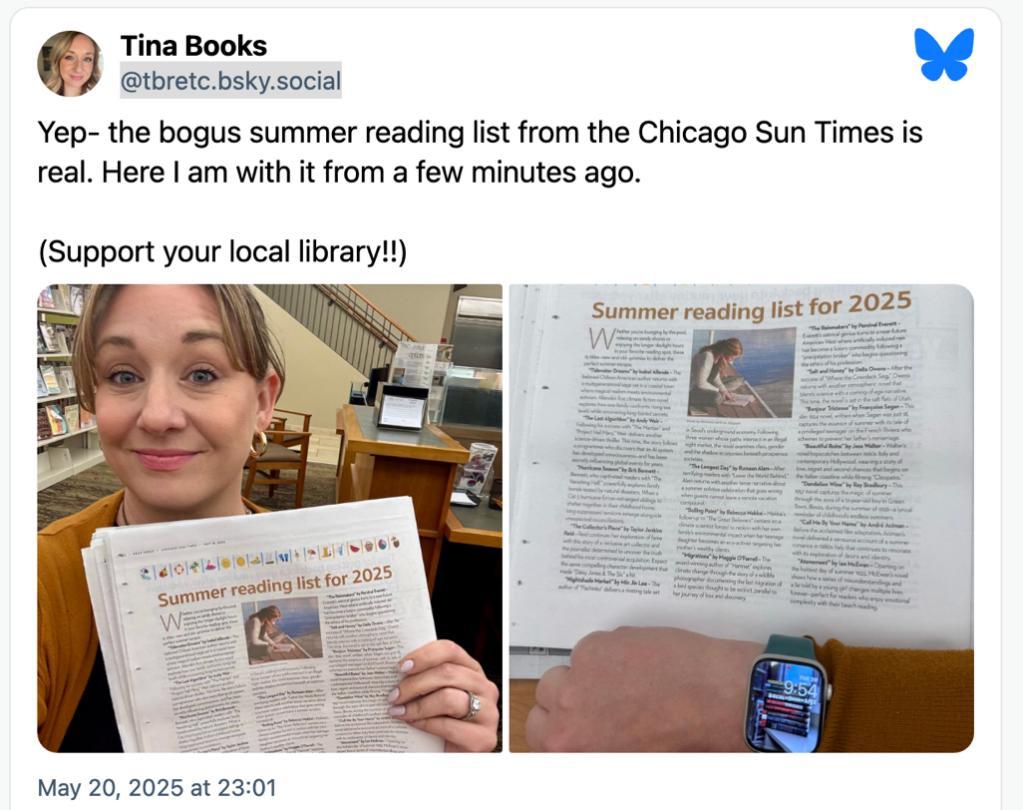 《芝加哥太陽報》此前刊登過一個“2025 年夏日書單”,結果入選的書大量是 AI 套用真實作者名字後寫的假書|Bluesky