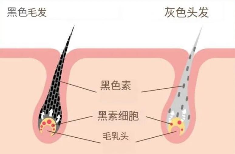 那麼,頭髮爲什麼會由黑變白的呢?一句話總結根本原因,就是毛囊色素單元中,黑素原性黑素細胞的功能障礙和細胞死亡。
