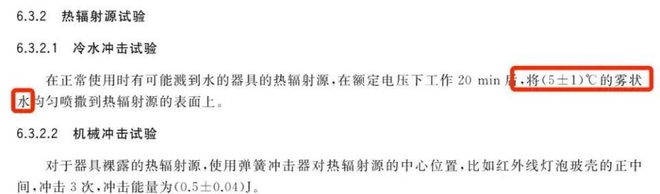 《浴室電加熱器具(浴霸)》標準中冷水衝擊試驗的規定,圖片來源:參考資料3