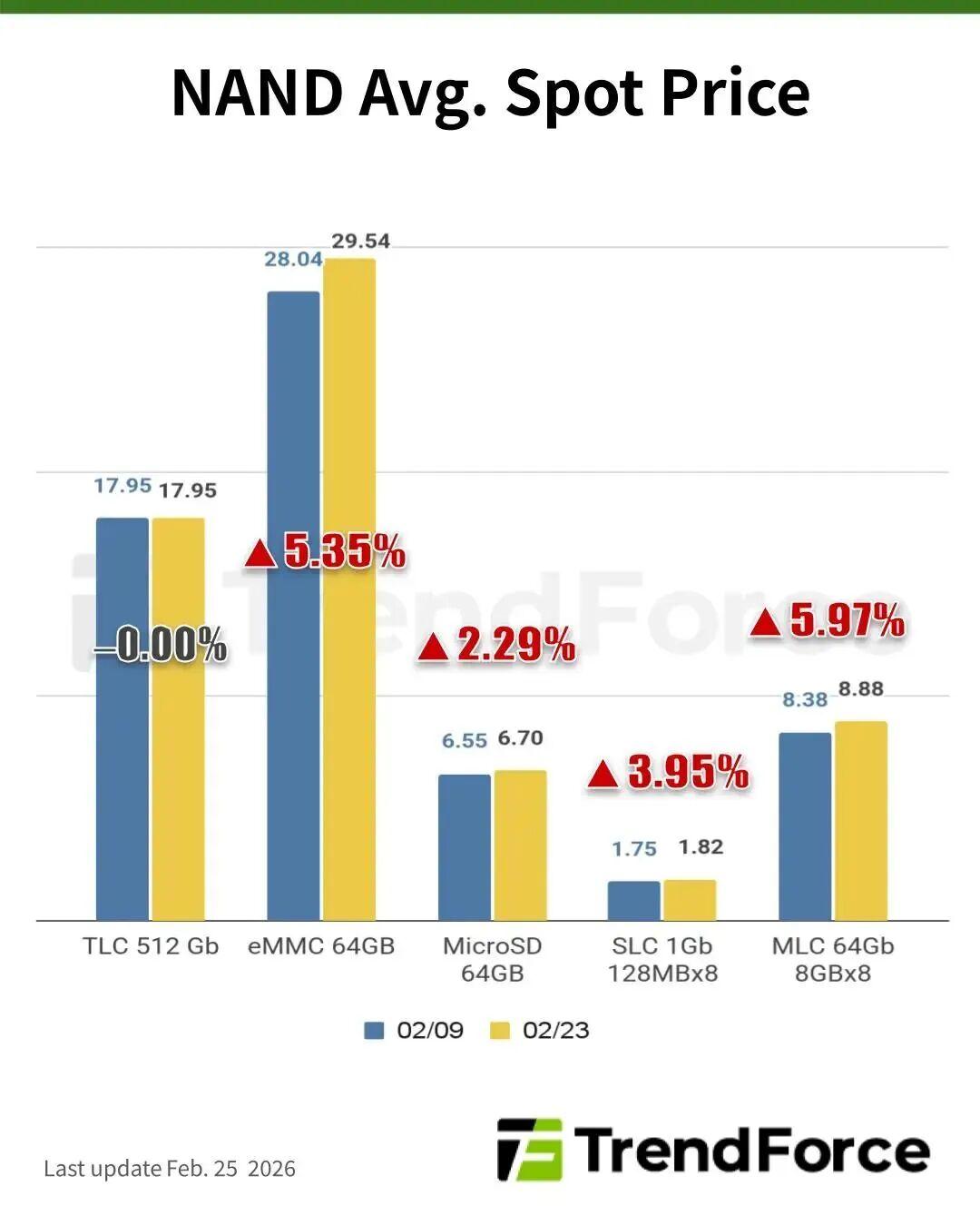 TrendForce 集邦諮詢 2026 年 2 月的數據顯示:近三個月手機存儲芯片現貨價格累計上漲超過 300%。