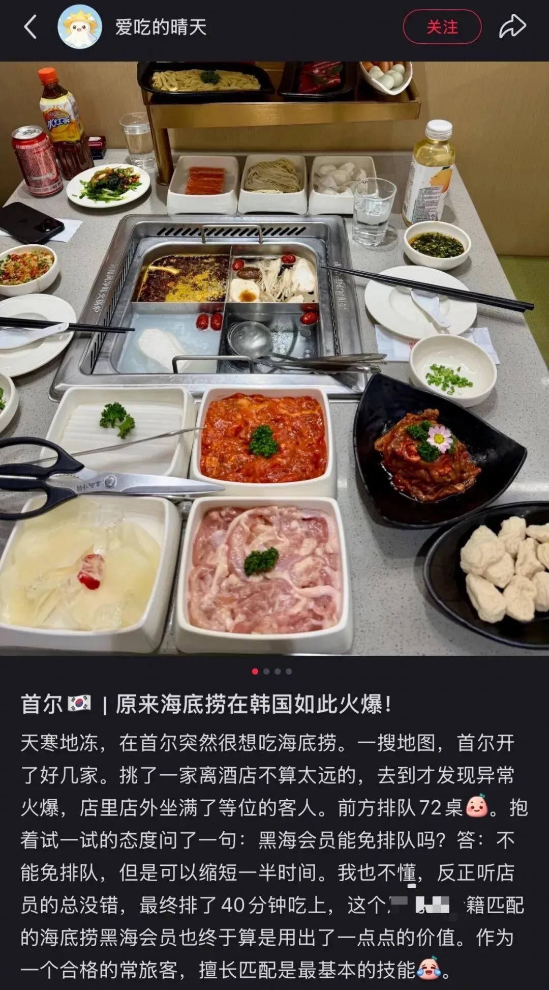 在首爾,海底撈的客單價在人均300到600塊左右,分量卻只有國內的一半,以至於有人算過一筆賬,與其在首爾爲了幾盤菜省喫儉用,不如直接買張飛中國的機票,既能順便旅遊,還能實現海底撈自由,走之前再代購一波,穩賺不賠。