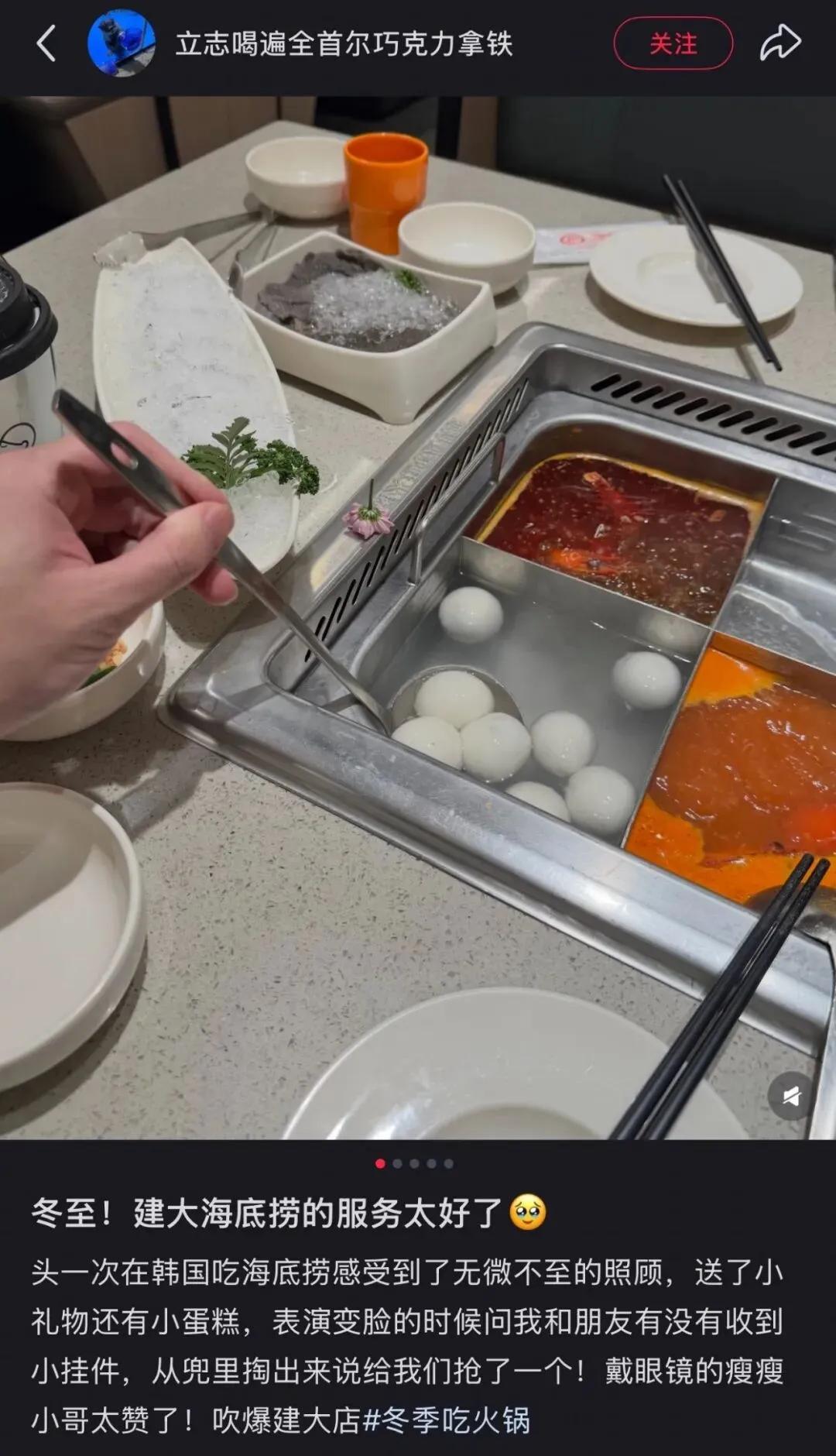 據說,韓國的海底撈,服務態度也是一流,“服務員不會因爲你只點個四宮格清水鍋就冷臉相待,也不會因爲你要求多加幾份免費零食而面露難色,他們維持着一種要把你寵壞的坦率,甚至連中國人去了都能感受到其中帶點卑微的超絕主動。”