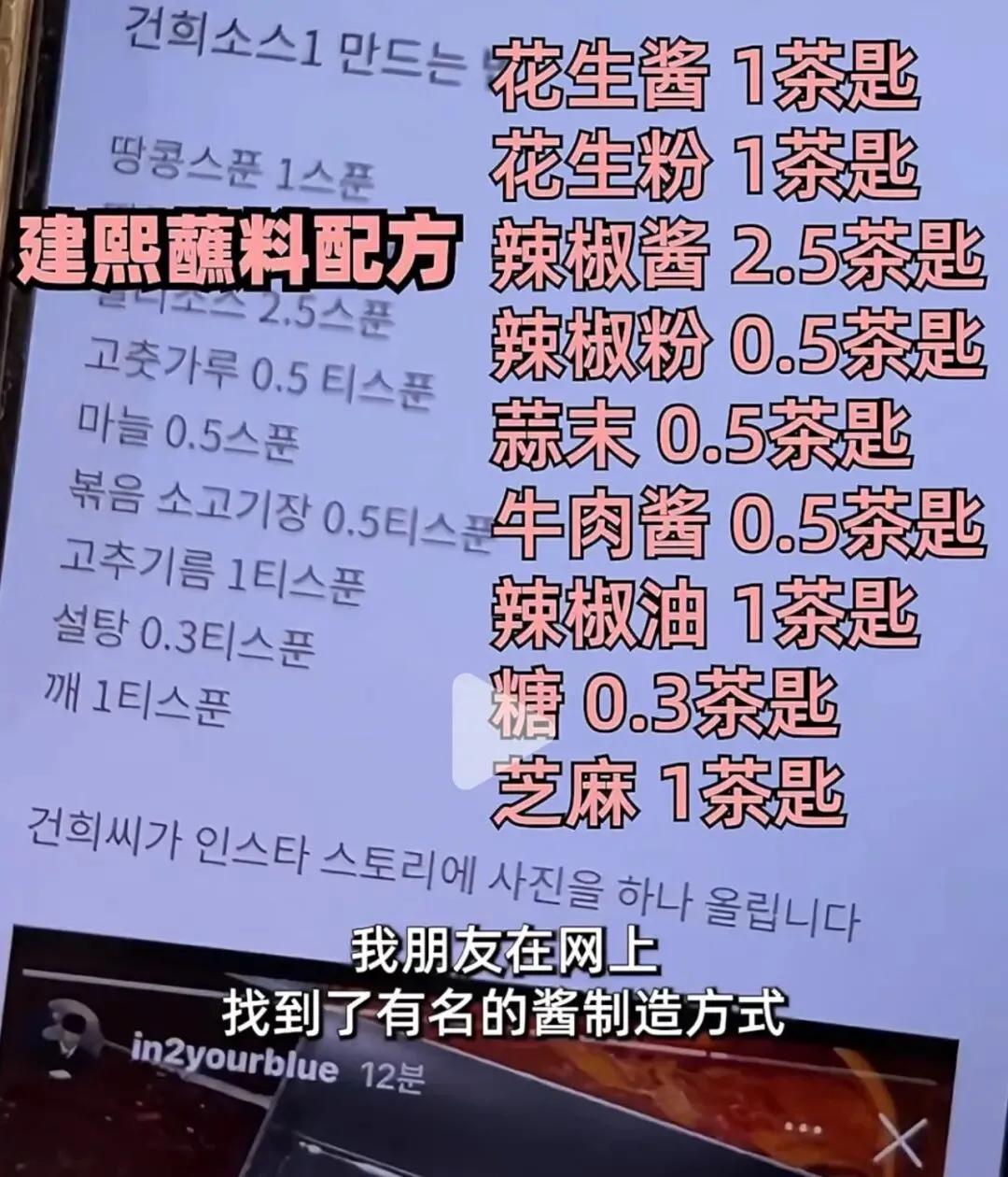 而且,這屆韓國年輕人也把調料臺玩成了過家家。早幾年,男團成員建熙發明的“建熙醬料”在韓網已經成了類似國家標準的存在,就在2025年,還更新了修正版配方,很多第一次喫海底撈的韓國人,都會盯着這個配方,小心翼翼地按克數復刻,生怕少放了一勺辣椒油,錯失了那口被全網封神的味道。