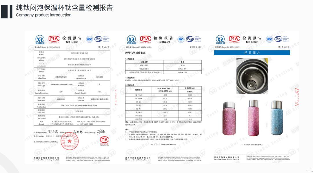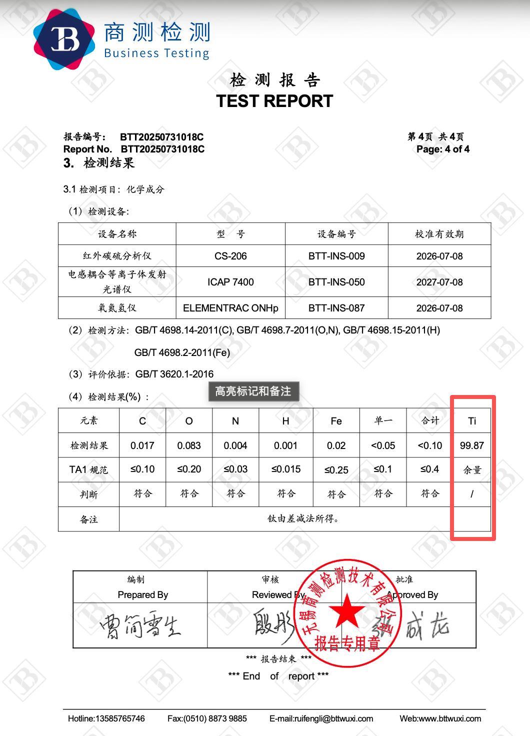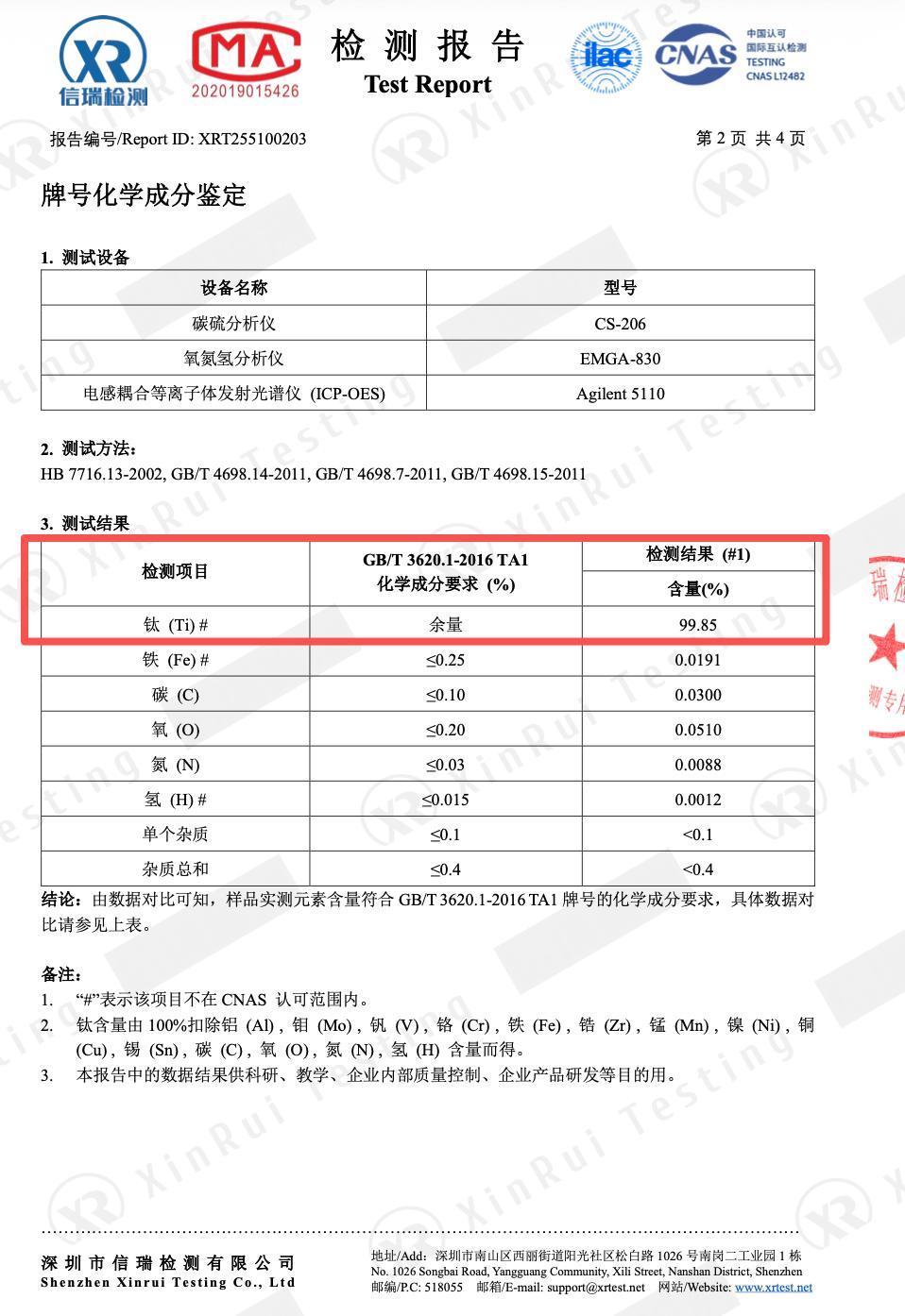 純鈦材料要嚴格遵循【GB/T3620.1-2016】這一國家標準,該標準中明確寫明:鈦含量>99.55%歸類爲純鈦,根據亦麟最新的原料檢測報告結果,亦麟鈦製品鈦含量爲99.85%。