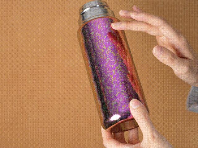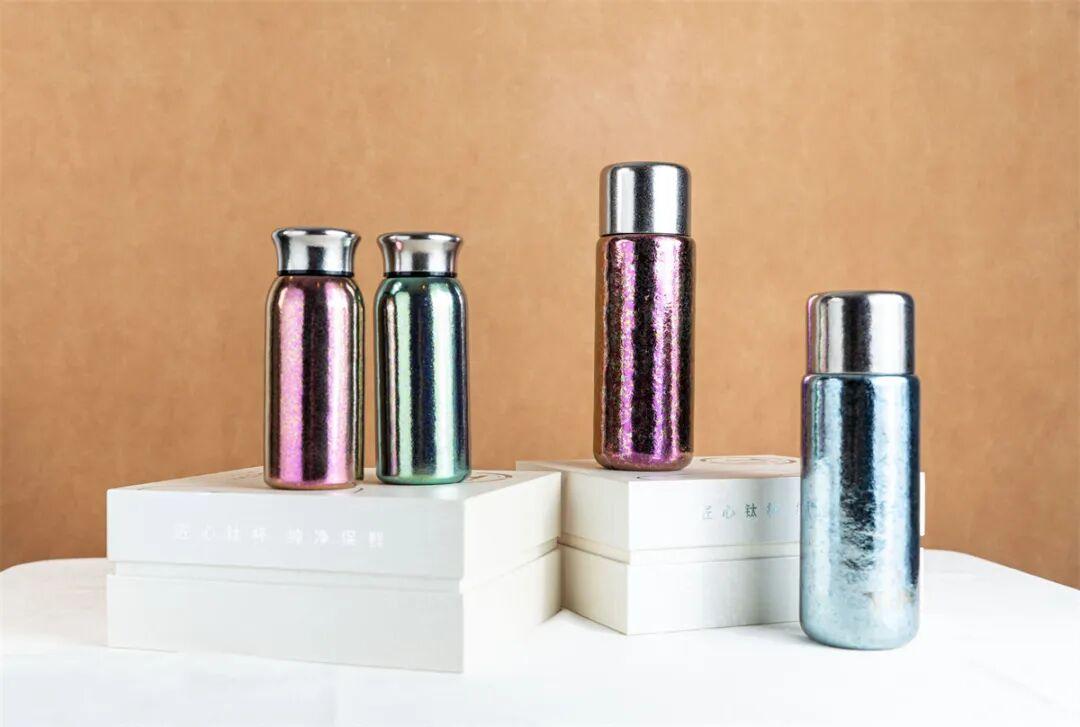 大家看到鈦杯表面有十分奇妙的鮮豔色彩,它們並不是化學噴塗的,全是鈦本身在高溫下燒製的顏色:200℃自然形成銀色,300℃淡黃色,400℃金黃色,500℃藍色……光下如幻彩,美如冰晶花紋一般。