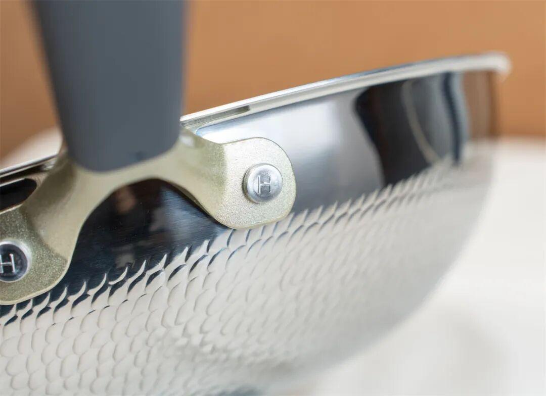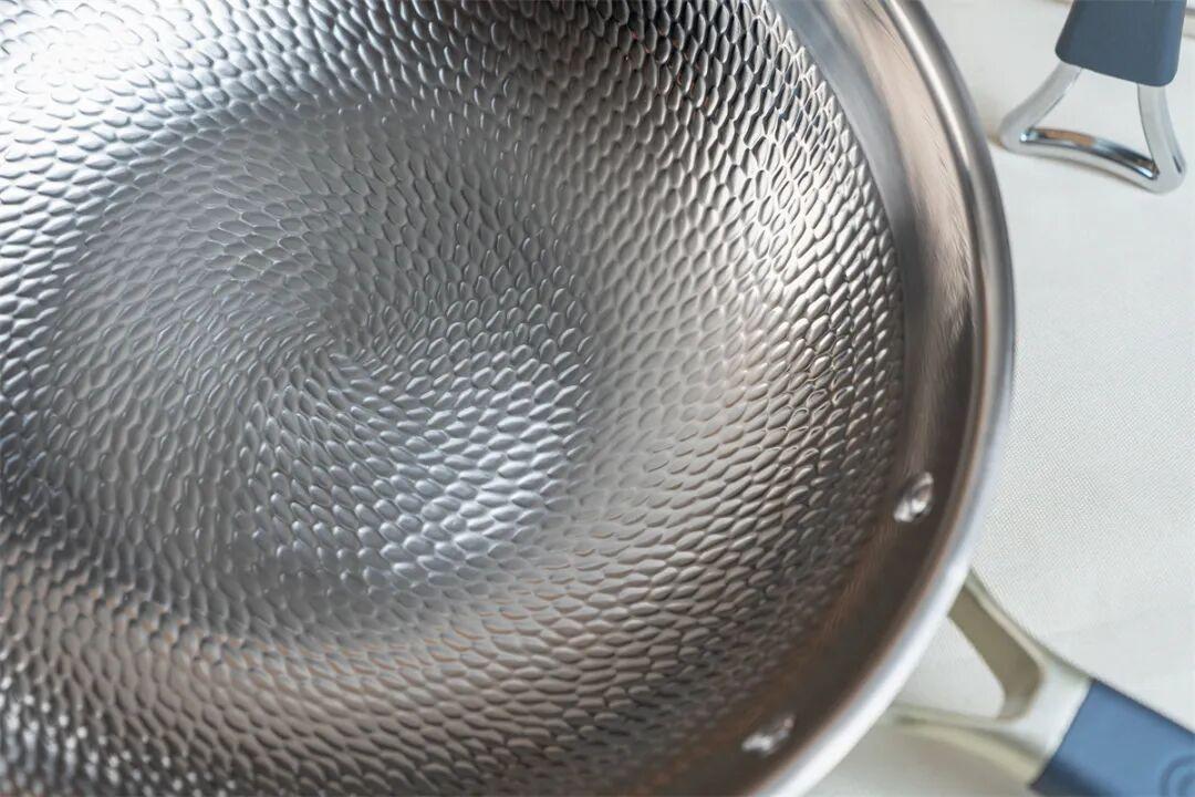亦麟的這款錘紋純鈦炒鍋則使用了【三層複合設計】:中間鋁層,外面是鋼,內壁是純鈦,利用不同金屬的導熱性,讓鍋內壁的鈦層受熱更加均勻,炒菜更美味。