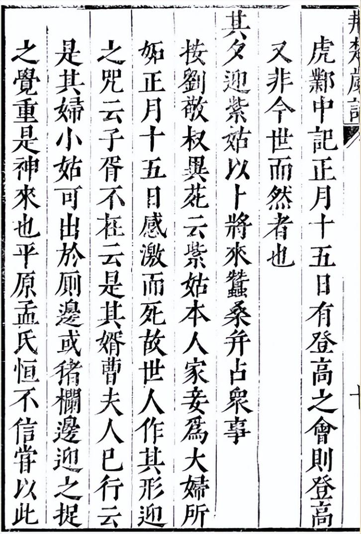 寶顏堂祕笈本《荊楚歲時記》書影。按照書中記載,正月十五本來的風俗是在油膏上澆油祭祀門神或蠶神(一位女性神祇),拜託蠶神趕走討厭的老鼠,保佑蠶繭大豐收。在後世的傳說中,蠶神與紫姑神有合一的趨勢,所以紫姑神也要管蠶事。