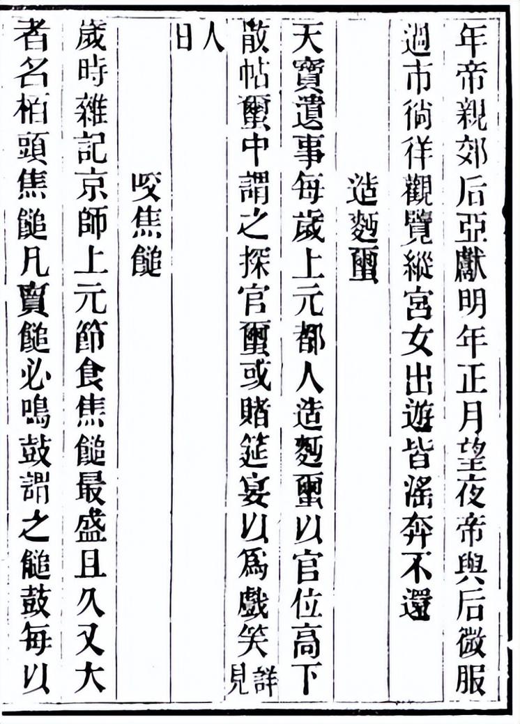《歲時雜記》裏還記錄了好幾種元宵節特色美食,比如科斗羹(一種用綠豆粉做的湯)、鹽豉湯(豆豉肉湯)、圓子(糯米圓子)、焦䭔(duī,炸湯圓)等等。作者認爲,最典型的節令食物就是焦䭔。