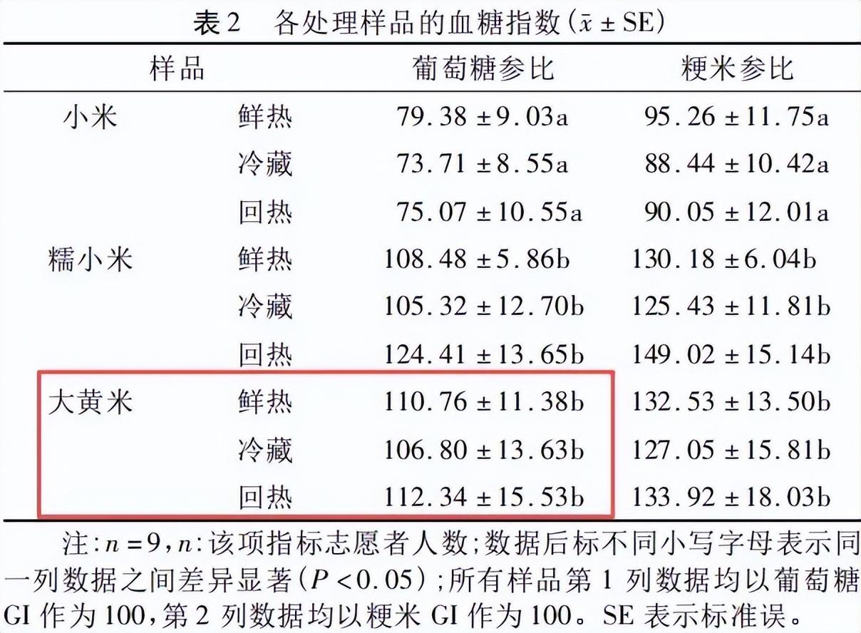 2017 年發表在《中國糧油學報》上的一篇文獻,分析了大黃米的餐後血糖反應,結果表明,新鮮烹調的大黃米樣品 GI 值爲 111,屬於高 GI 範疇,在鮮熱、冷藏(4℃,24 小時)與回熱狀態下 GI 值均處於較高水平,這表明冷藏處理並不能明顯降低大黃米的餐後血糖反應。[8]不過,放涼後口感會變得更勁道、黏性減弱,更容易咀嚼和下嚥。