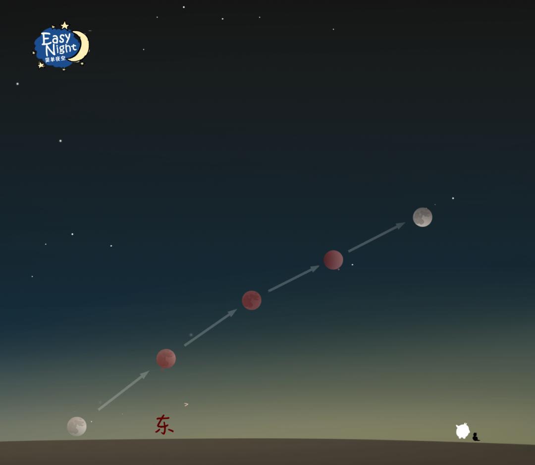 月食發生時,從東偏北的位置升起,經過正東方,到東偏南結束 | EasyNight