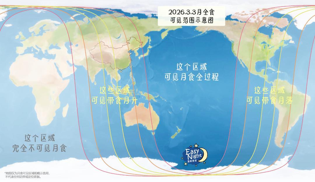 全球可見月食的地區,主要在太平洋上,而中國和東亞大部分地區可見帶食月升 | EasyNight