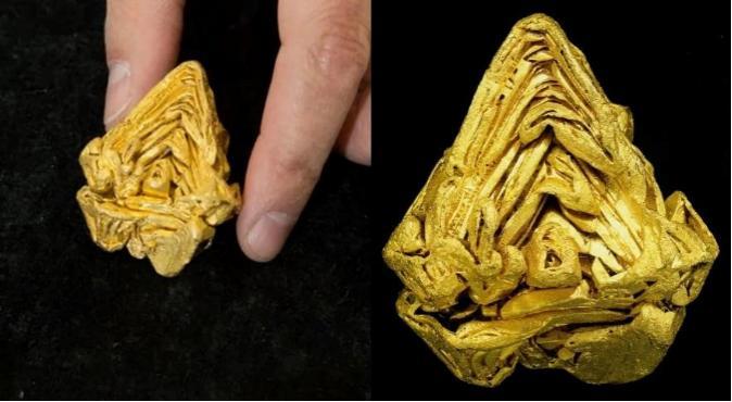 倘若結晶生長空間足夠寬敞且環境安穩,金子則會展現出它優雅的一面——生長成完美的晶體。它們有的像精美的樹葉(葉片狀),有的像蜷曲的金屬絲(髮絲狀),甚至有的長成完美的八面體。不過這種金子極其罕見,通常只有在博物館裏才能見到,而其價值遠超金子本身的重量。