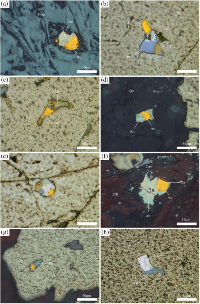 圖:反射光下偏光鏡的含金礦物。其中Au—自然金.Cav—碲金礦.Ptz—針碲金銀礦.Alt—方鉛礦.Py—黃鐵礦.Cp—黃銅礦.Qz—石英.Cal—方解石.丨Gao et al.,2015 OGR)