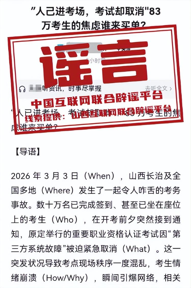 詳情:近日,網上出現“人已進考場,考試卻取消,83萬考生的焦慮誰來買單”等信息,引發關注。相關網帖聲稱,“2026年3月3日,山西長治發生職業資格認證考試因‘第三方系統故障’被迫緊急取消的考務事故,導致考點現場秩序混亂”等。經山西省長治市人社局調查覈實,長治市並未組織此類考試,網傳相關內容皆爲不實信息。