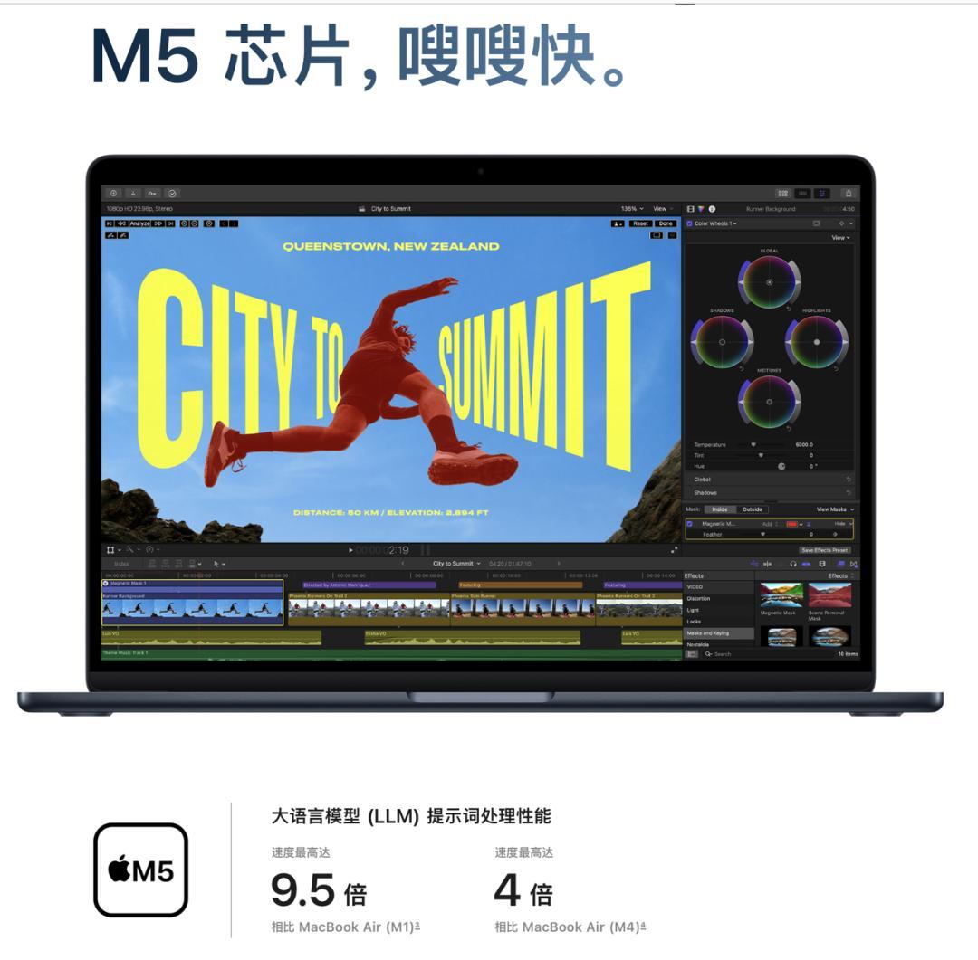 外觀還是那個帶劉海的 60Hz LCD 屏幕,基礎配置依然是 16GB 內存起步,更新點就是換上了單核性能更強、神經網絡引擎算力翻倍的 M5 芯片。