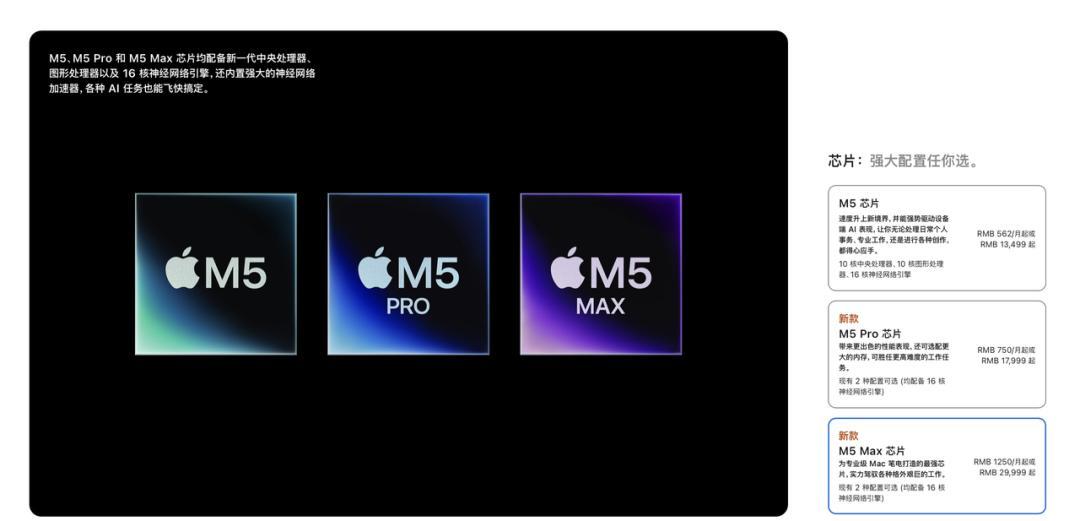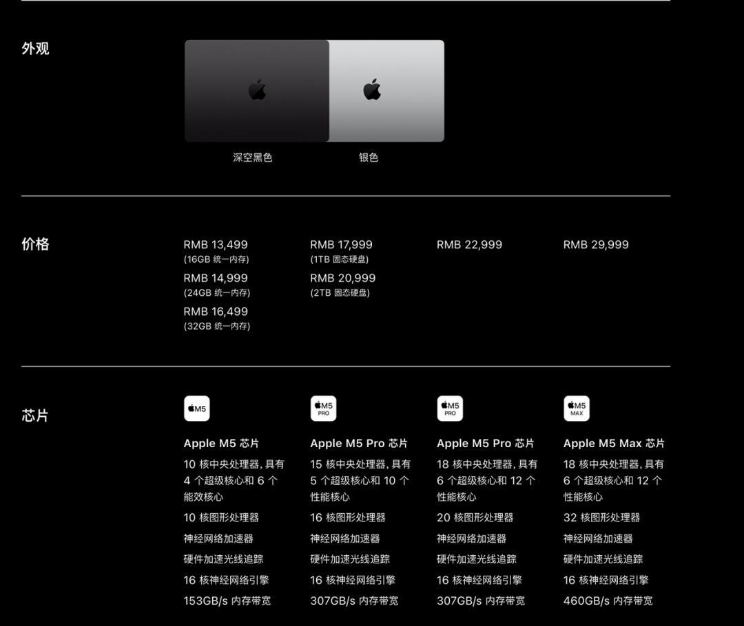 MacBook Pro 這次還是用 M5、M5 Pro 和 M5 Max 三款芯片區分版本,版本之間涇渭分明、價差極大。