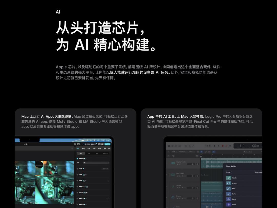 以前蘋果賣 Mac,喜歡放幾條對比柱狀圖,告訴你“用 Final Cut Pro 導出 8K 視頻比上代快了百分之多少”、“用 Logic Pro 能開多少條音頻軌道”。但到了 M5 這一代,這些創作者的傳統手藝全被擠到了角落裏。