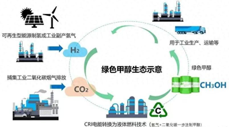 綠醇是一種綠色低碳的醇類燃料,其核心屬性“綠色”體現在生產主要依賴可再生能源(如太陽能、風能、水能等),通過這些可再生能源電解水製取氫氣,再與二氧化碳進行反應合成甲醇。隨着原料和技術的快速迭代與進步,綠醇家族還將包括綠色乙醇或其他多碳醇。
