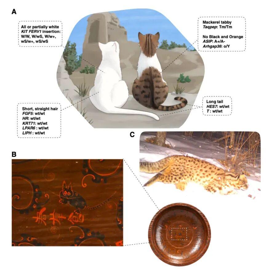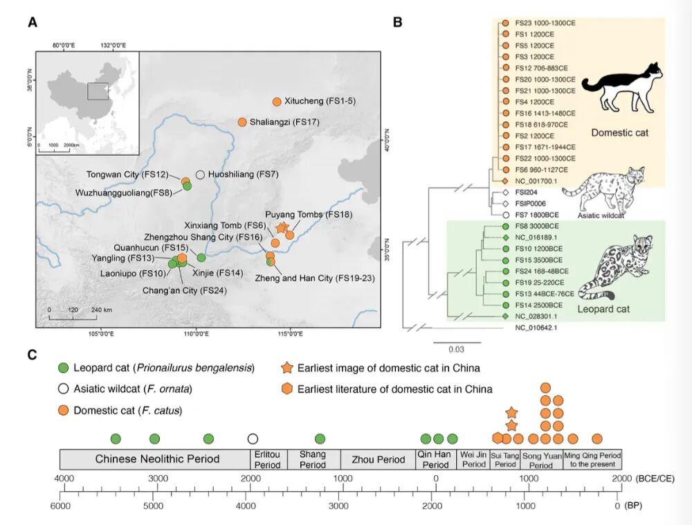 中國古代遺址貓科動物遺骸的地理分佈(A)、系統發育關係(B)及年代演變規律(C) | 參考文獻[1]