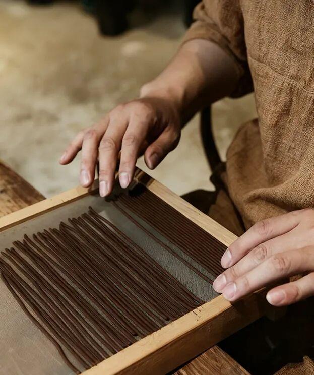 爲了讓大家放心使用,聞六堂拒絕使用任何合成的香精、粘合劑,但其實這也對制香手法更嚴苛,因此聞六堂請老師傅們用古法制香技藝,經過“沾、搓、浸、展、掄、切、晾、染、曬”多道手法工藝,歷經近600多個小時,終於製成這色彩豐富的茶香線香。