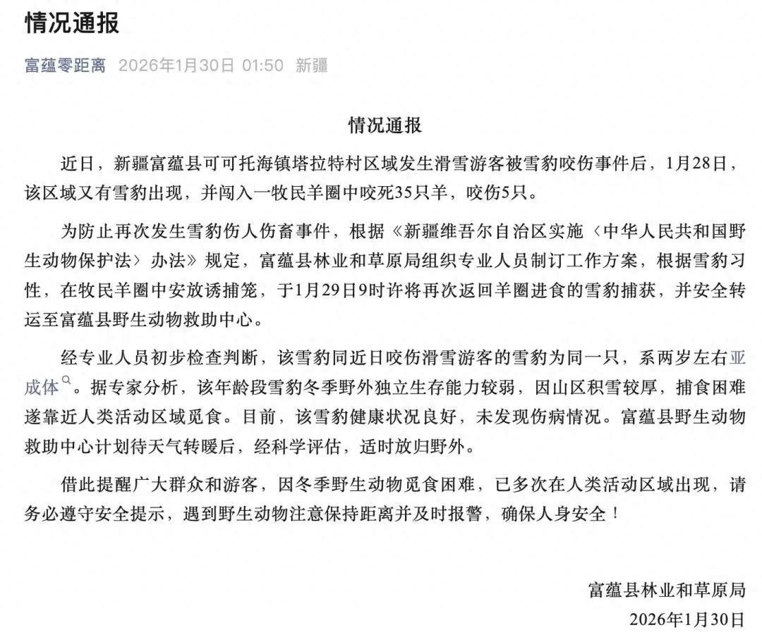 前一陣子,新疆可可托海雪豹傷人的事件登上了熱搜。在該事件報道後沒多久,當地有關部門發佈通告,有牧民的羊遭到雪豹襲擊,共有35只羊被咬死,5只被咬傷,在將涉事雪豹捕獲後,有關人員初步判斷該雪豹與傷人雪豹爲同一個體。