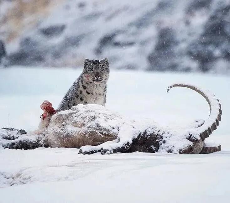 雪豹殺死了一隻碩大的北山羊丨© Valerie Maleev