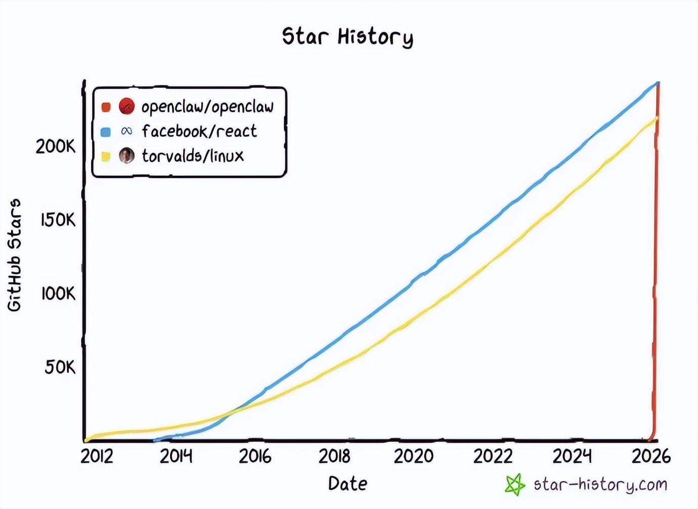 星標可以看成是某個開源軟件項目受歡迎的程度。我們把這三個最著名的項目的星標增長曲線放在一張圖上,可以看到,和另外兩個項目不同,龍蝦的增長曲線幾乎是觸目驚心的垂直線。