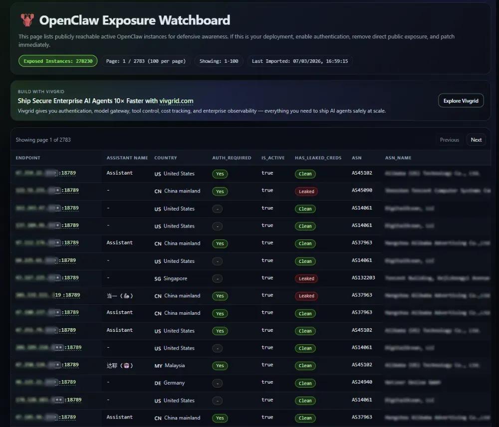 https://openclaw.allegro.earth/ 該網站記錄了目前有漏洞可公開訪問的龍蝦,以提醒用戶及時修補漏洞