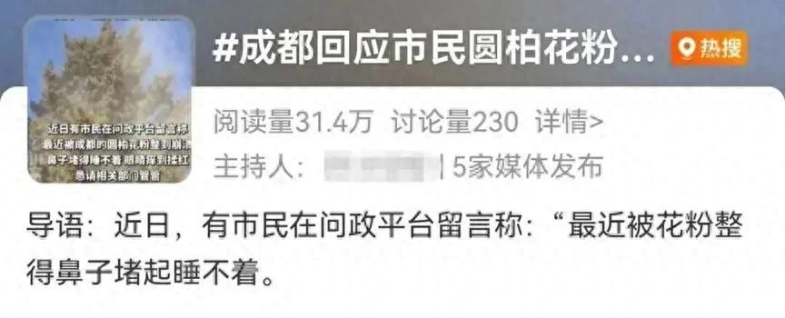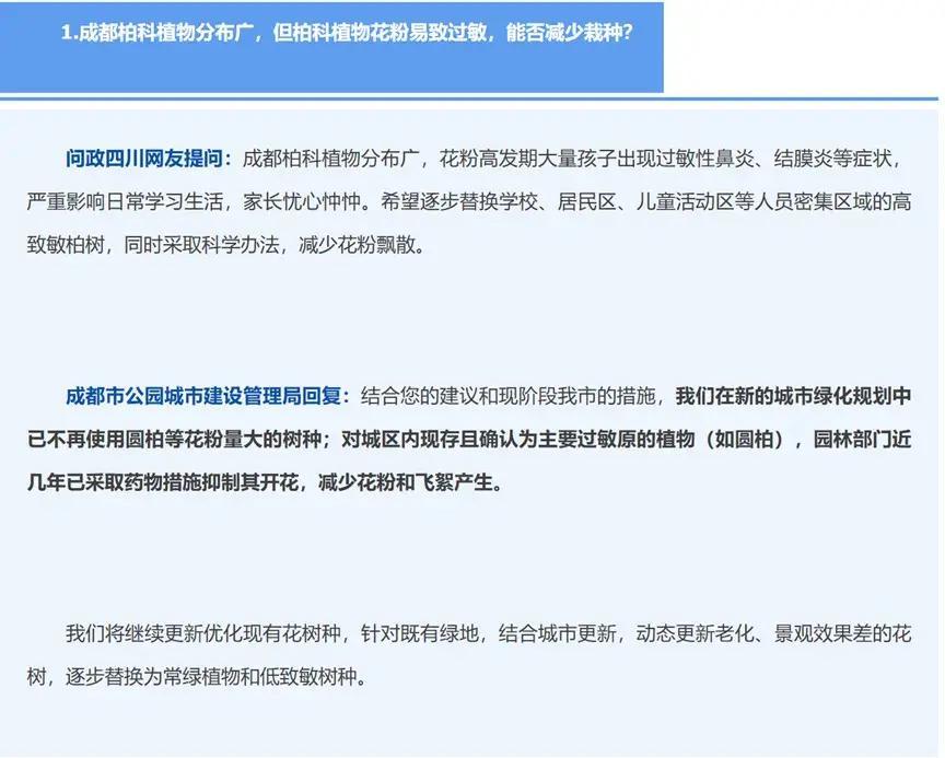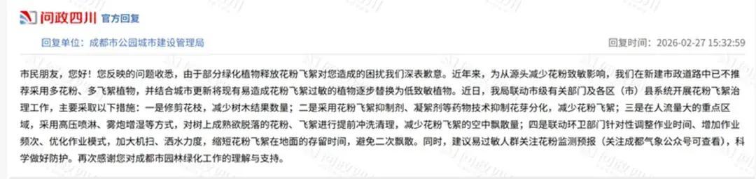 針對市民訴求,成都市公園城市建設管理局作出回應,近日聯動市級有關部門及各區(市)縣系統開展花粉飛絮治理工作。