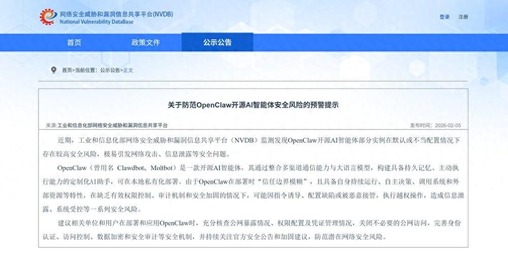 強大的自動化執行能力在躍升生產力的同時,也讓政企系統面臨着前所未有的安全考驗。近期,OpenClaw的爆火就引發了國家監管層面的高度關注。工信部網絡安全威脅和漏洞信息共享平臺(NVDB)監測指出,OpenClaw在默認或不當配置下存在較高風險,極易引發網絡攻擊與信息泄露。