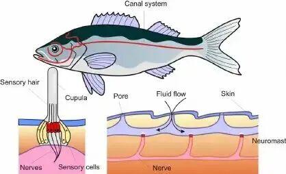 它分佈在魚的表皮和管道內,內部的毛細胞對水流位移和0到200赫茲的低頻壓力梯度極其敏感。每條魚身體周圍存在一個物理排斥區,當有鄰近物體靠近時側線系統會觸發迴避反應。