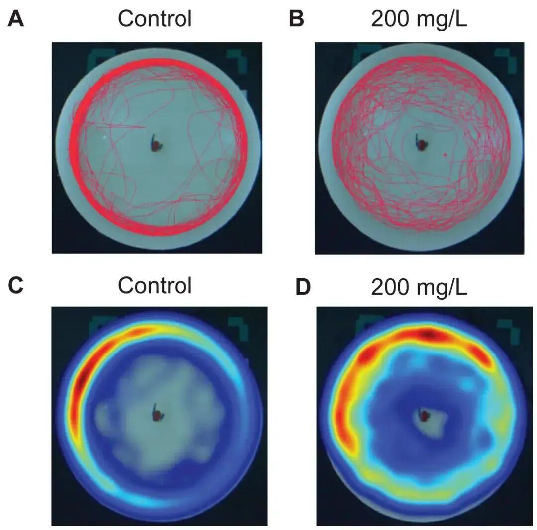 下圖圖 A中,紅線代表一條正常的魚(對照組 Control)在被放入陌生的圓形水箱後的遊動軌跡。你可以看到,它幾乎像個掃地機器人一樣,死死貼着最外圈的邊緣遊動,水箱的中心區域對它來說彷彿是“禁區”。