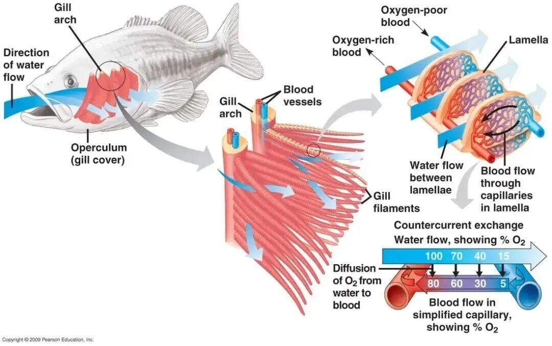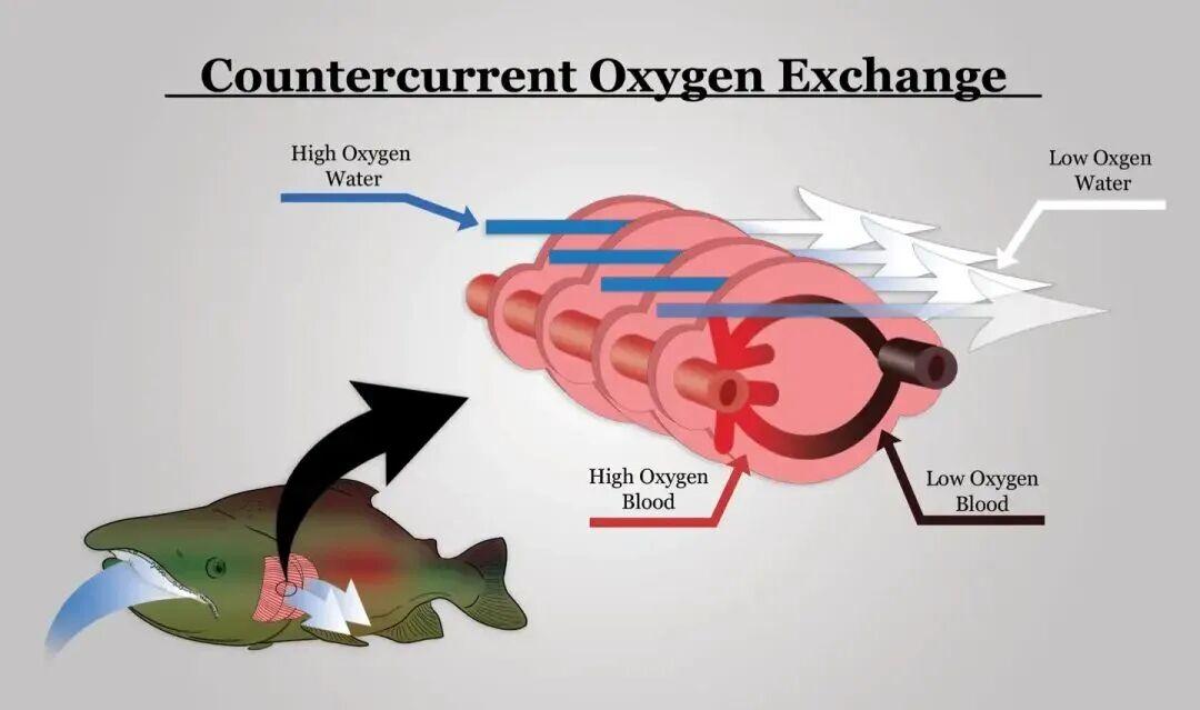 逆流交換確保了含有較少氧氣的靜脈血接觸含氧量較低的水,而動脈血接觸剛入口的含氧量最高的水,從而維持完整的氧氣濃度梯度,實現最大化氧氣提取。