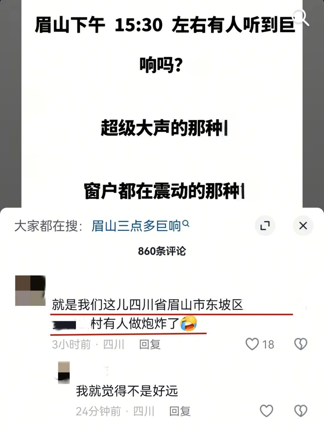 2025年12月,東坡區網民李某(男,32歲)爲尋求刺激、博取關注,在某短視頻平臺一則關於“眉山出現不明巨響”的視頻評論區,捏造併發布“就是我們這兒四川省眉山市東坡區XX鄉XX村做炮炸了”等虛假言論。經公安機關依法調查,李某在未覈實事實的情況下,故意編造並傳播涉及公共安全的爆炸類謠言信息,誤導大量網民關注和討論,擾亂社會正常秩序。公安機關已依法對李某予以行政處罰。