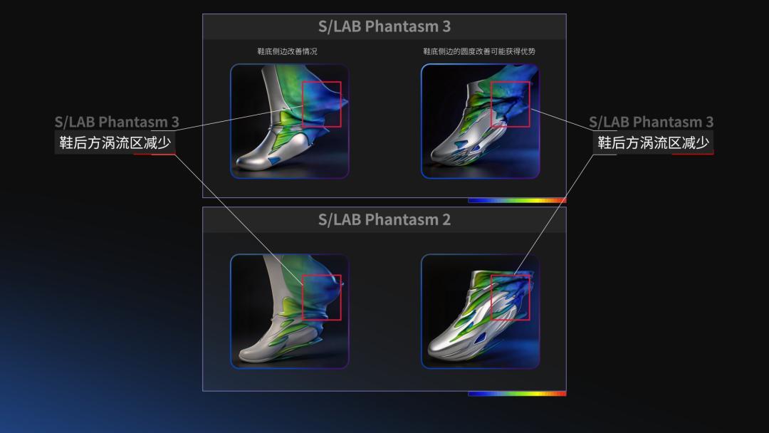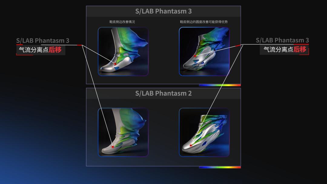 而在氣流形態的可視化畫面中可以看到,包裹腳踝的護罩結構確實起到了作用:氣流從鞋面流經腳踝時,不再是突然分離形成渦流,而是更平滑地過渡過去。鞋身圓潤的輪廓也讓氣流分離點後移,從而減少了後端壓強產生的阻力。