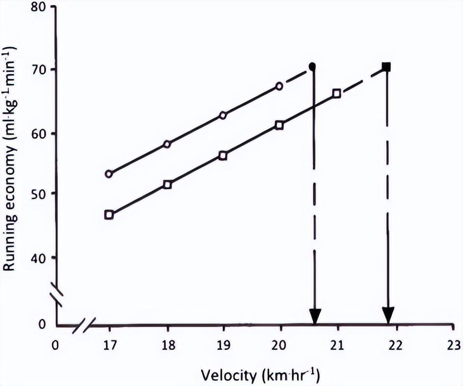 最大攝氧量(VO2max)代表有氧能力,是單位時間跑者有氧代謝能產生的最大能量值。如果把人比作汽車,相當於汽車排量/最大馬力。VO2max越高,跑者把氧氣從心肺輸送到外周肌肉組織的能力越高。高水平馬拉松運動員VO2max 大約爲70~85mL/kg/min,幾乎已經接近生理上限。[3]在相同配速下,耗氧量越低,跑步經濟性就越好。[4] 如果能減少用來對抗空氣的那部分能耗,成績自然更有提升空間。