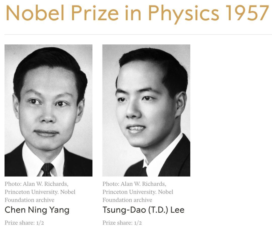 1957年,楊振寧與李政道因“對所謂的宇稱定律的深入探究,導致了有關基本粒子的重大發現”而榮獲諾貝爾物理學獎。