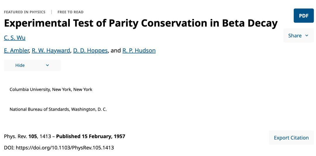 一個如此根本性的發現,其關鍵的實驗驗證者,難道不配分享這份最高榮譽嗎?在她的論文《β衰變中宇稱守恆的實驗檢驗》中,吳健雄提到她與李、楊進行了“富有啓發的討論”。那麼,是性別偏見作祟?是她的論文錯過了截止日期?還是她根本從未被提名?
