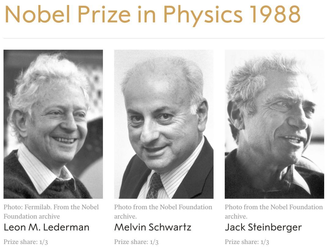 1988年的諾獎,左至右:萊德曼,施瓦茨和施泰因貝格,獲獎理由是:“發現μ子中微子,創建了中微子束方法,並證明了輕子的二重態結構”,不過對大衆來說,萊德曼最有影響力的成就,是創造了“上帝粒子”這個名詞。