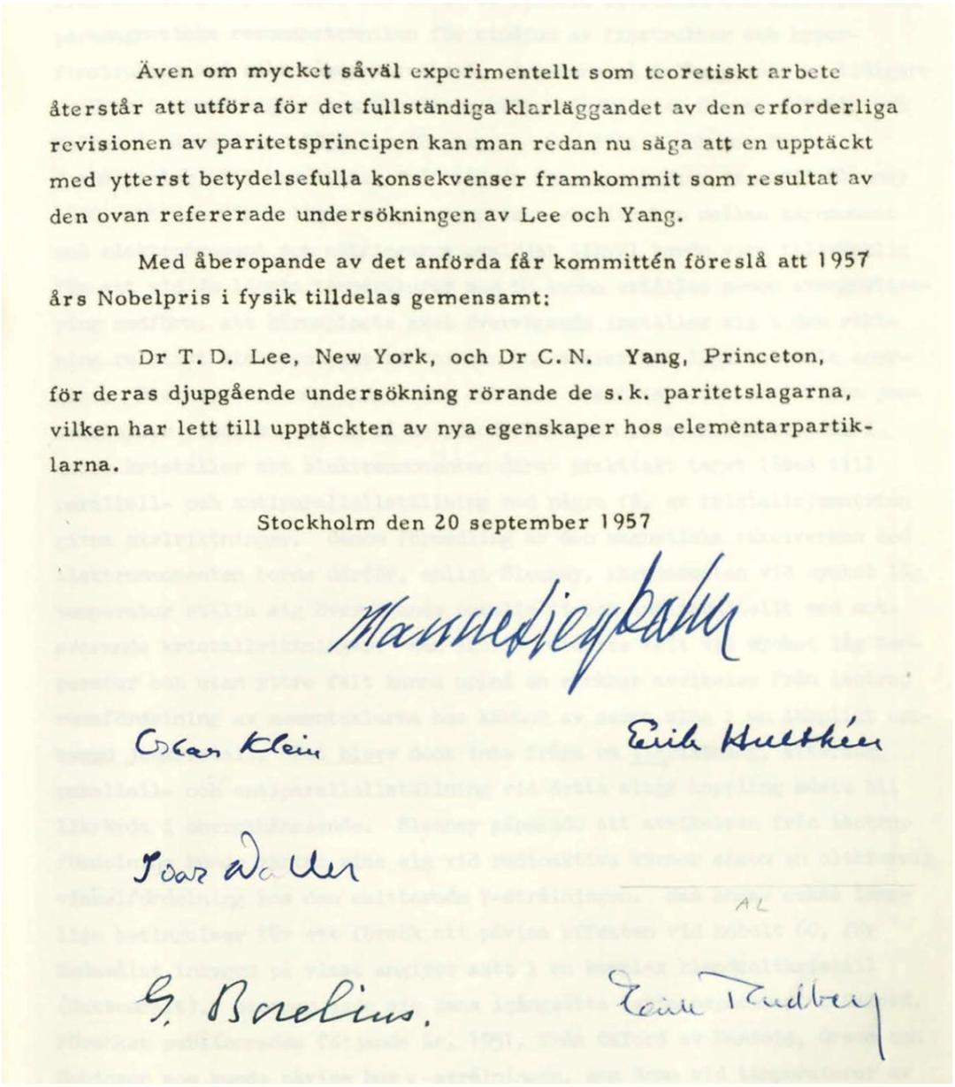 儘管爲全面闡明宇稱原理所需修訂的實驗與理論研究工作仍需大量開展,但已可斷言,通過李與楊上述研究取得的發現,已產生具有極其重大意義的結論。基於上述理由,委員會提議將1957年諾貝爾物理學獎聯合授予:李政道博士(紐約)與楊振寧博士(普林斯頓),以表彰他們對所謂宇稱定律的深入探索,這一研究引領了對基本粒子新特性的發現丨諾貝爾檔案,瑞典皇家科學院,斯德哥爾摩
