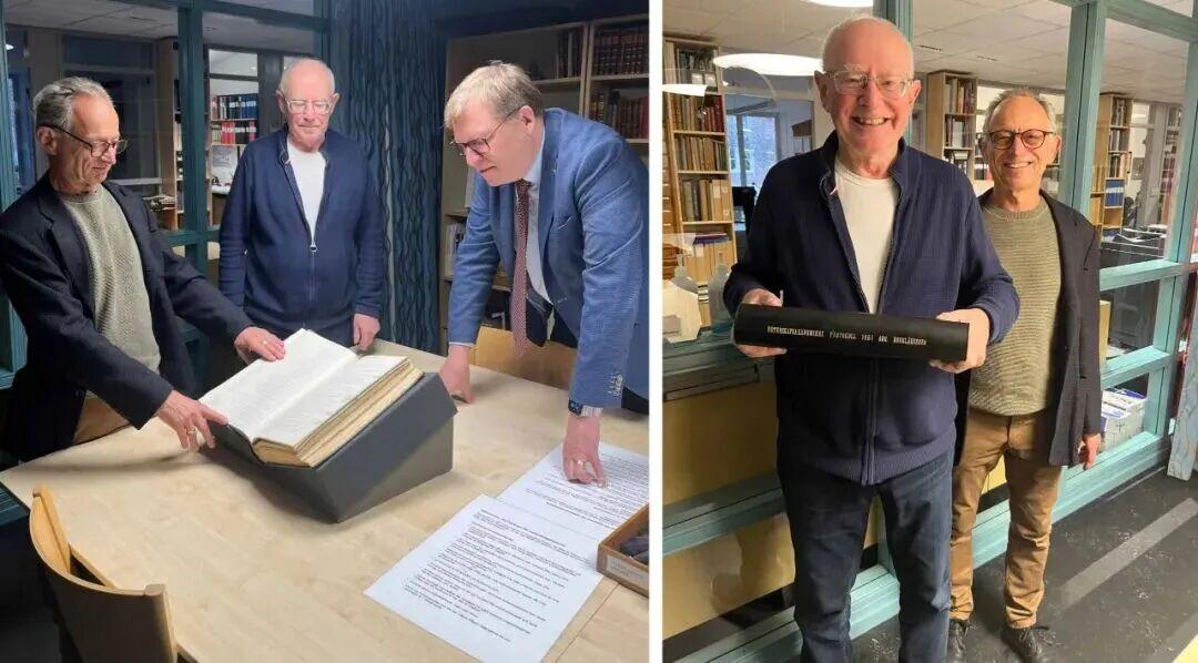 歷史的現場。左:2025年11月13日,在瑞典斯德哥爾摩的瑞典皇家科學院科學史中心,馬茨和拉蒙成爲首批查閱1957年諾貝爾物理學獎提名檔案的人。右:馬茨和拉蒙手捧珍貴的歷史檔案。丨Anne Miche de Malleray