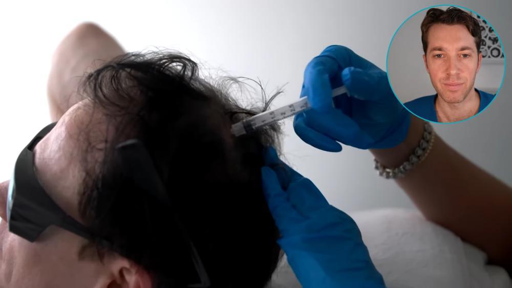布萊恩在對自己的頭皮用外泌體,右上角對此操作面露痛苦之色的是Ross Kopelman醫生。